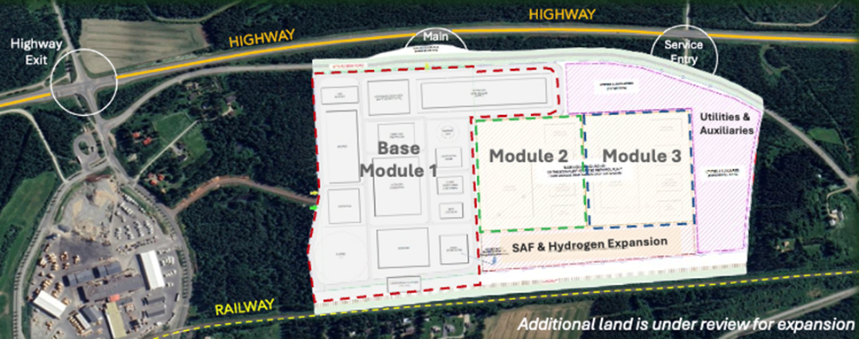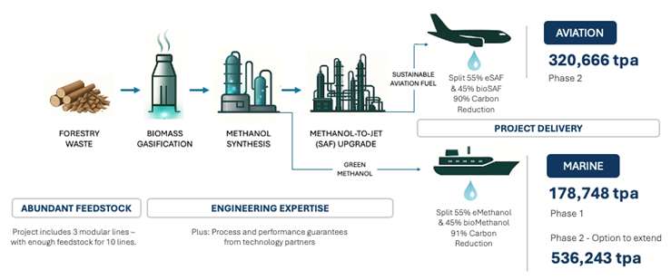 - 180,000 tpa SAF on completion of Module 3 – split 55% eSAF & 45% bioSAF
